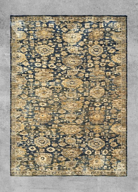 Bold yet sophisticated, the Capri Rug is designed for those who appreciate intricate detailing with a modern twist. The navy base, accentuated by gold and beige tones, creates a striking contrast that adds a regal charm to any room. The delicate floral-inspired motifs lend a touch of tradition, while the overall distressed finish gives it a contemporary edge.