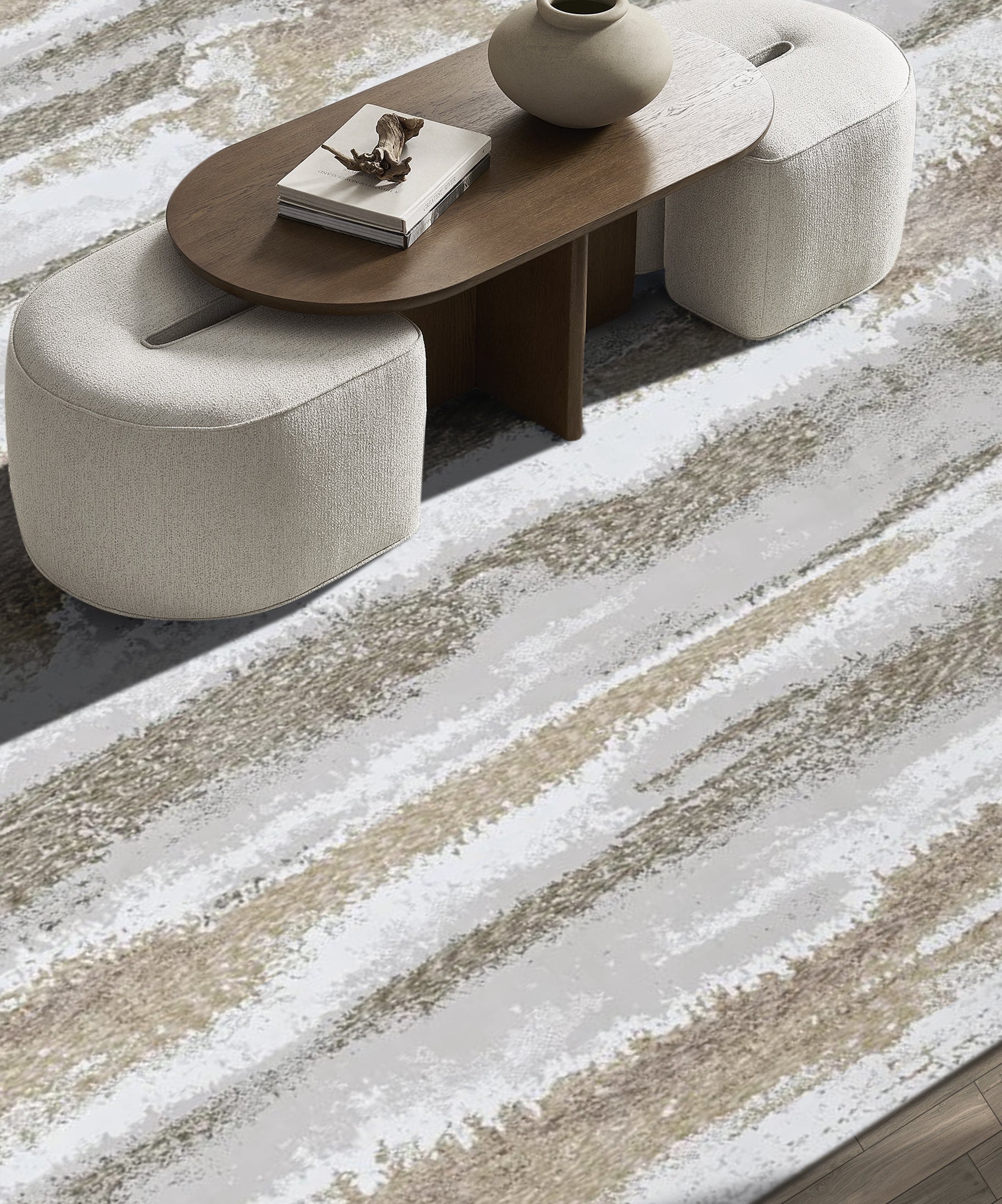 The Desert Veil carpet is a masterful expression of modern minimalism blended with organic inspiration. It features a soothing palette of camel, beige, and ivory tones that seem to drift into one another like wind-blown dunes. The abstract fade design draws from nature’s subtle transitions—earth meeting sand, light meeting shadow—creating a soft yet striking presence that brings calm and cohesion to any space. Its design is refined yet relaxed, perfect for open living rooms, serene bedrooms, or contemporary office environments.