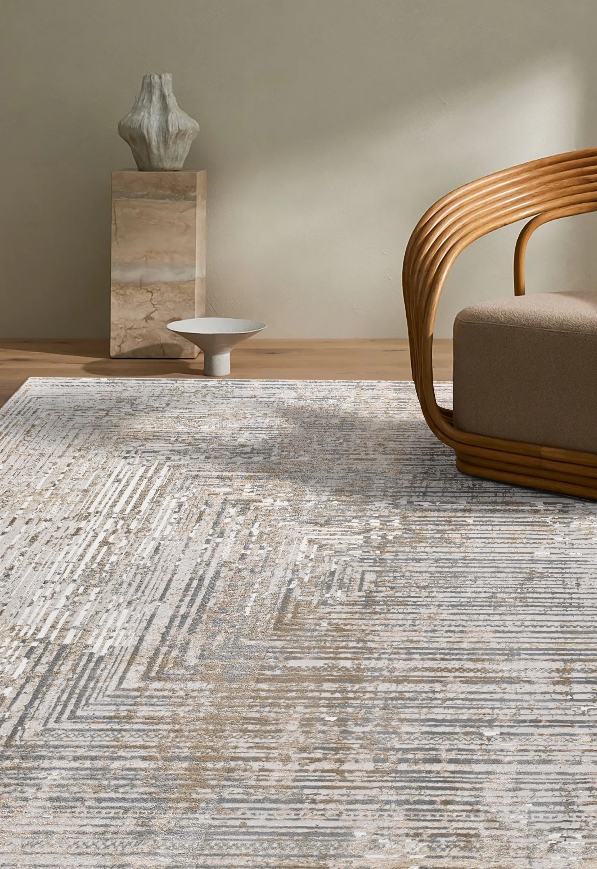 Earthbound Horizon is a masterful fusion of natural elements and contemporary aesthetics, evoking the raw beauty of sunlit landscapes and weathered terrains. The intricate design reflects the organic patterns found in nature, reminiscent of aged rock formations, wind-swept earth, and the layered textures of time-worn surfaces. A blend of soft neutrals, earthy browns, and muted ivory tones creates an effortless harmony that seamlessly integrates with both modern and rustic interiors. The distressed, abstract motif captures the essence of nature’s imperfections, delivering an understated elegance that transforms any space into a sanctuary of warmth and tranquility. Whether placed in a minimalistic urban loft, a nature-inspired retreat, or a refined contemporary home, this carpet serves as an artistic foundation that enhances the character of its surroundings.