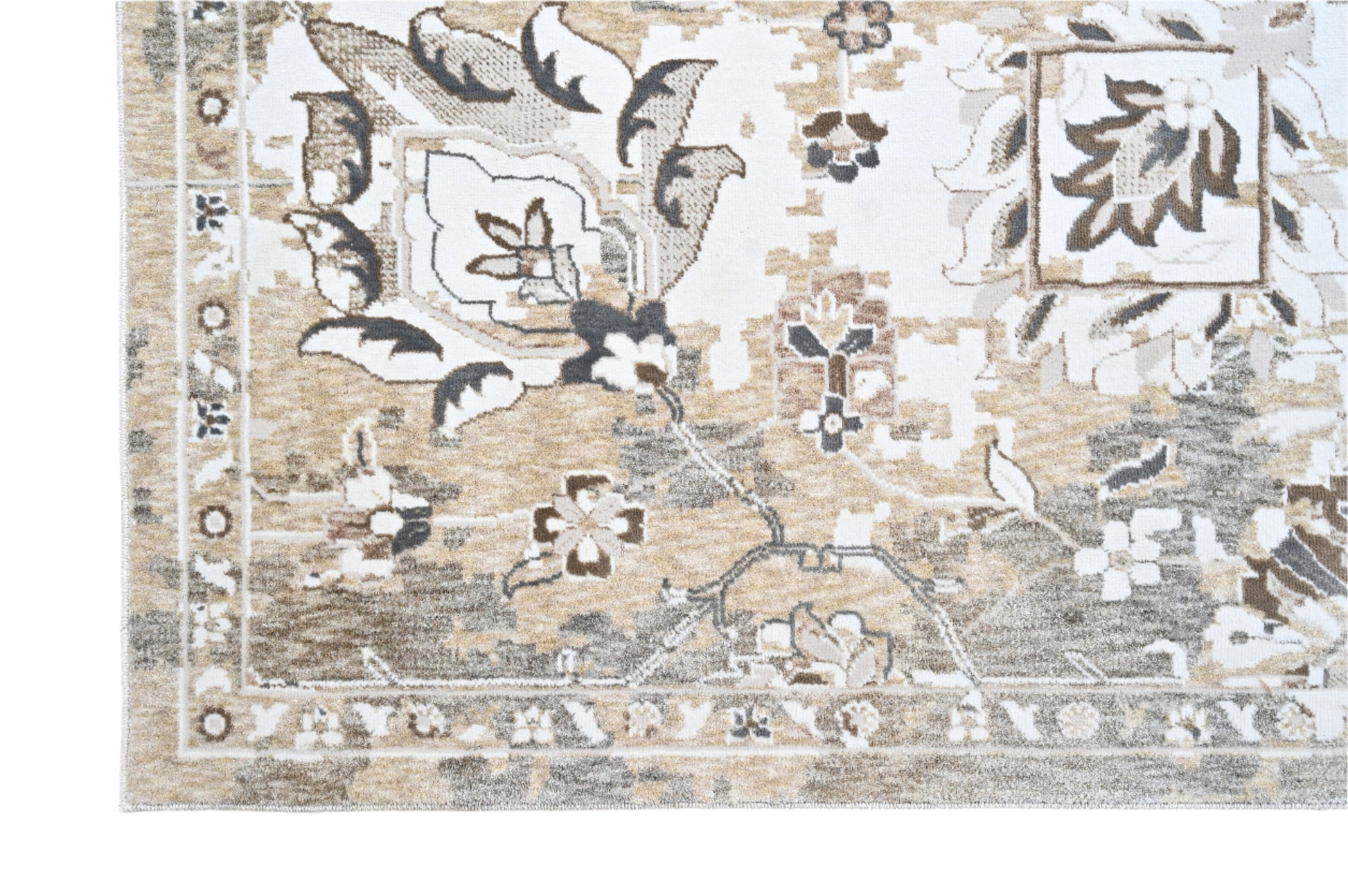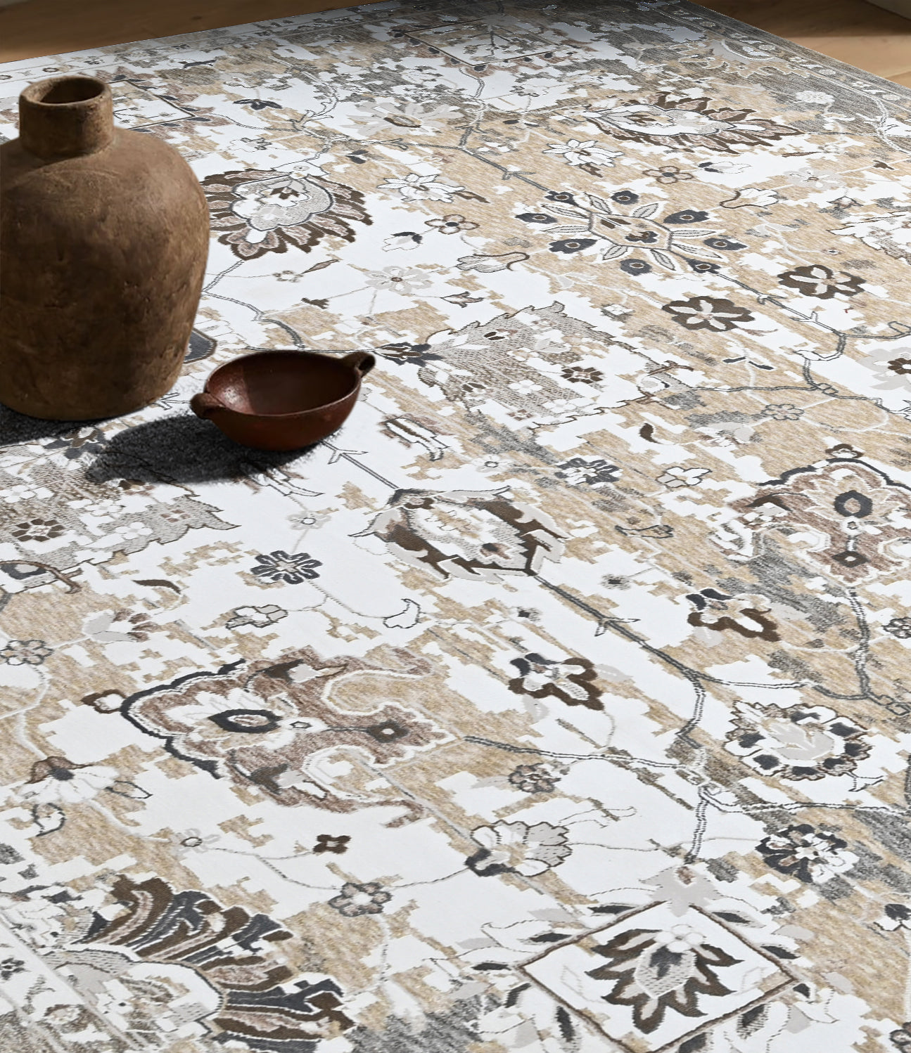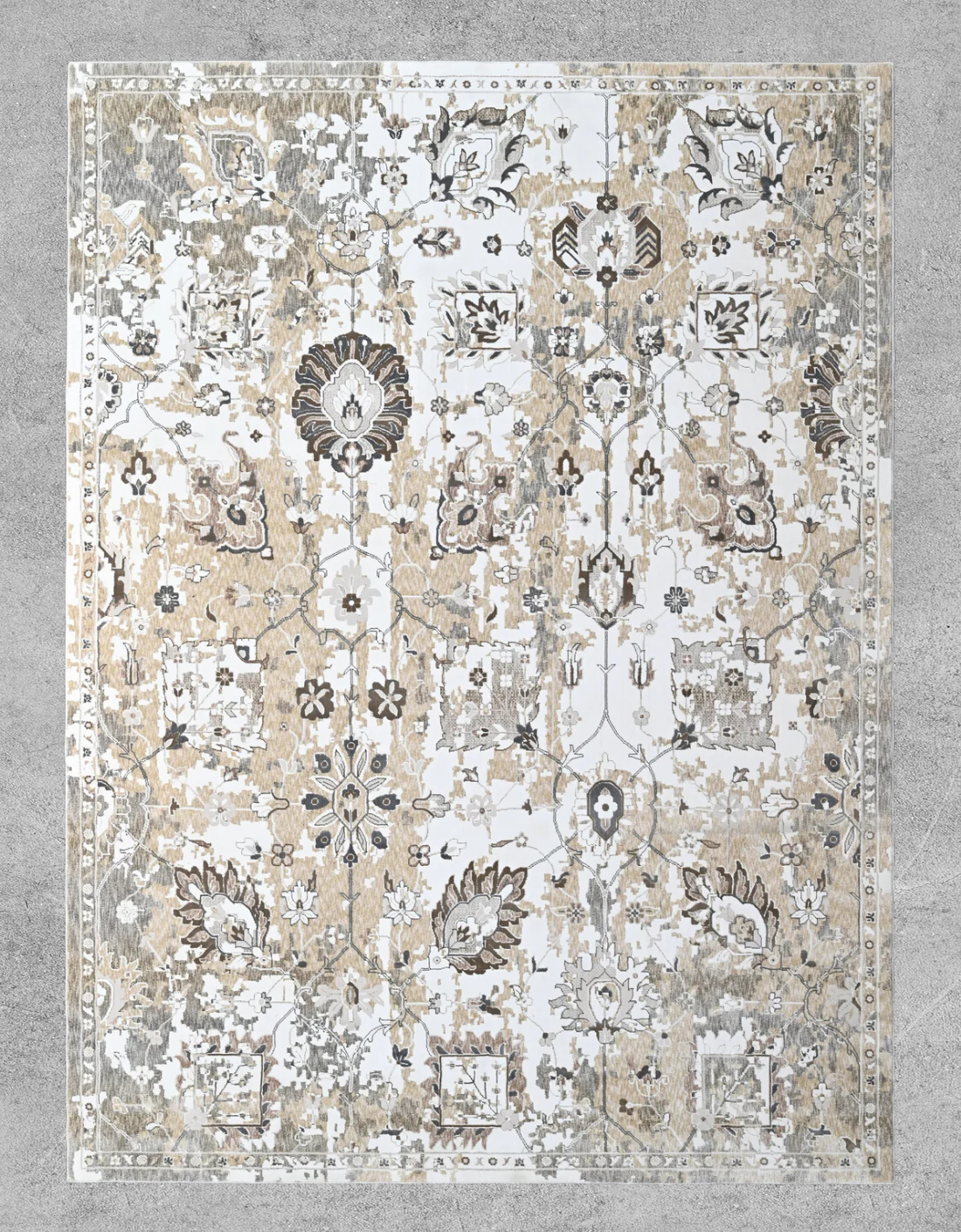 Golden Bloom is a tribute to nature’s timeless artistry, capturing the delicate elegance of a sun-kissed meadow in full bloom. Its intricate floral motifs, gracefully interwoven with classic ornamental patterns, exude a sense of regal charm while maintaining a soft, inviting presence. The harmonious blend of warm ivory, muted gold, and earthy taupe creates a luminous effect, evoking the beauty of nature bathed in gentle sunlight. Subtle distressing throughout the design lends it an antique allure, making it an exquisite piece that seamlessly bridges tradition and modernity.