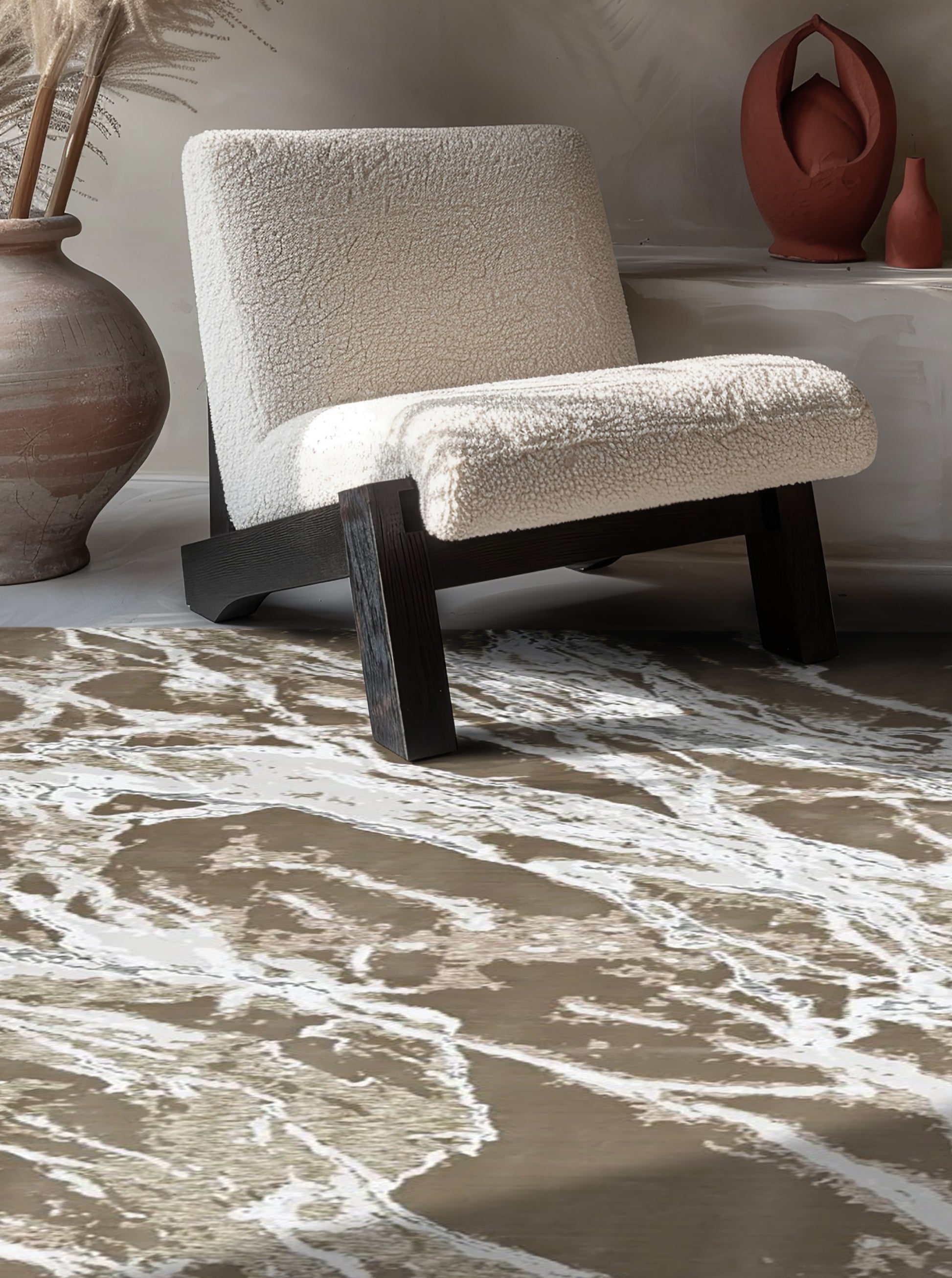 The Marble Luxe carpet brings the opulence of natural stone to textile form, mimicking the dramatic beauty of white marble streaked with flowing veins of radiant gold and taupe. With a high-contrast design that echoes the movement and fluidity of nature’s most luxurious surfaces, this piece transforms the floor into a statement of sophistication and grandeur.