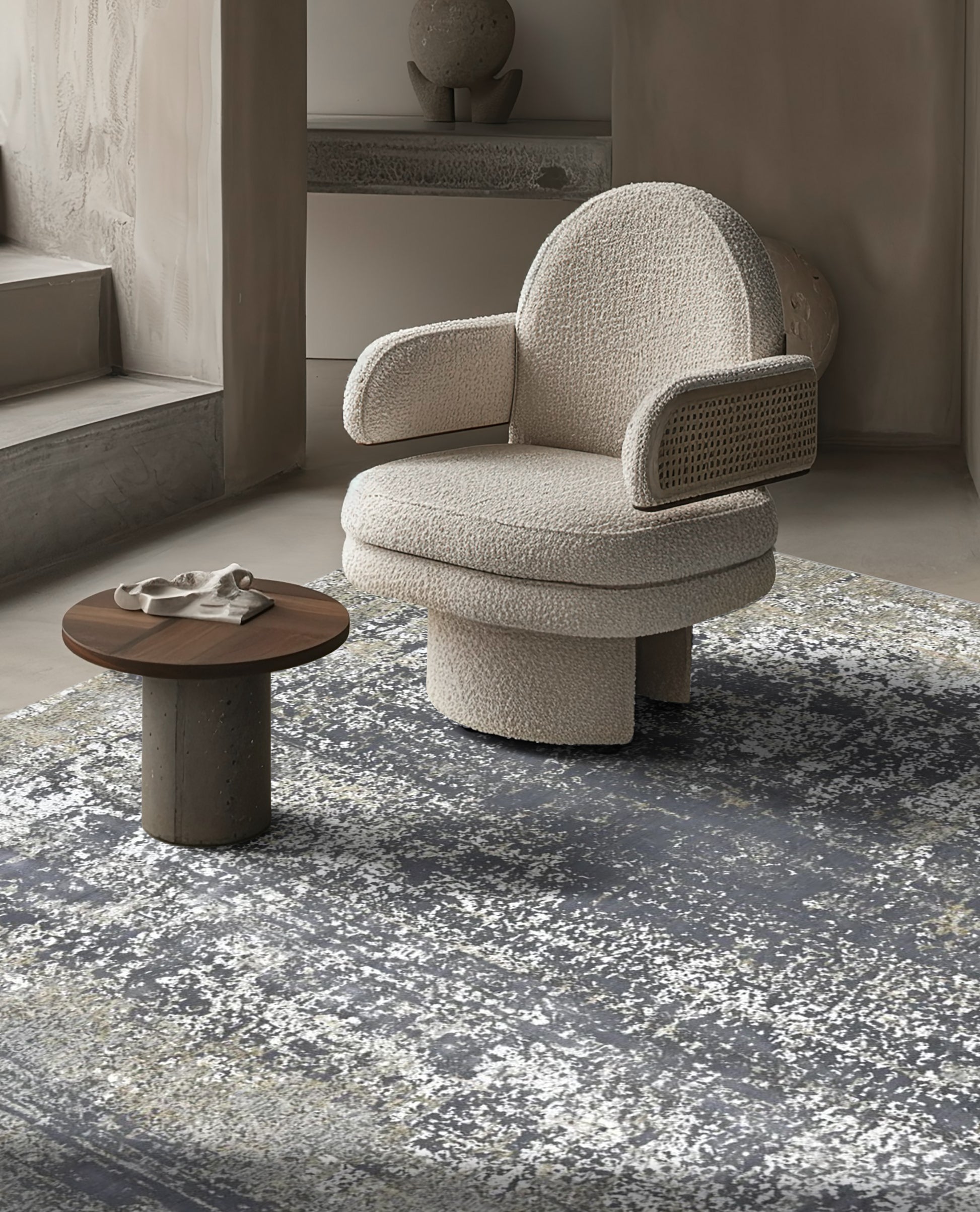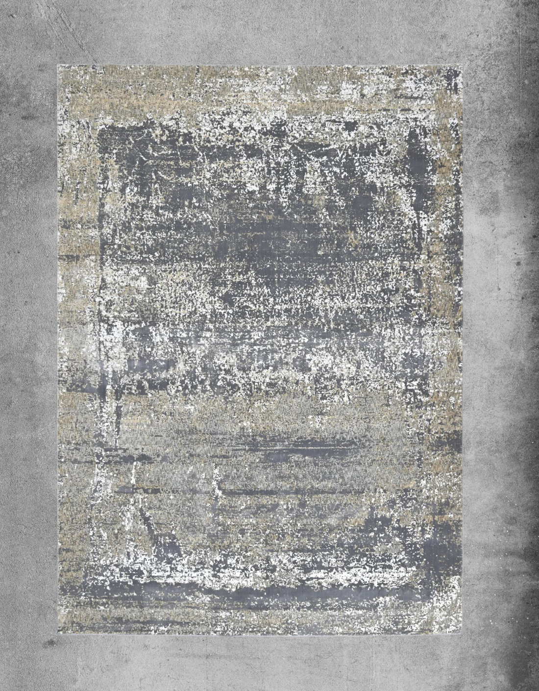The Industrial Mist – Grey Horizon carpet captures the raw essence of weathered urban textures blended with soft sophistication. Inspired by aged concrete walls and metallic patinas, its design evokes the subtle beauty found in decay and transformation. Layers of smoky grey, muted gold, and pale ivory are gently eroded across the surface, creating an abstract landscape that feels at once industrial and serene. This piece offers a harmonious blend of ruggedness and refinement, making it a perfect grounding element for contemporary and transitional interiors.