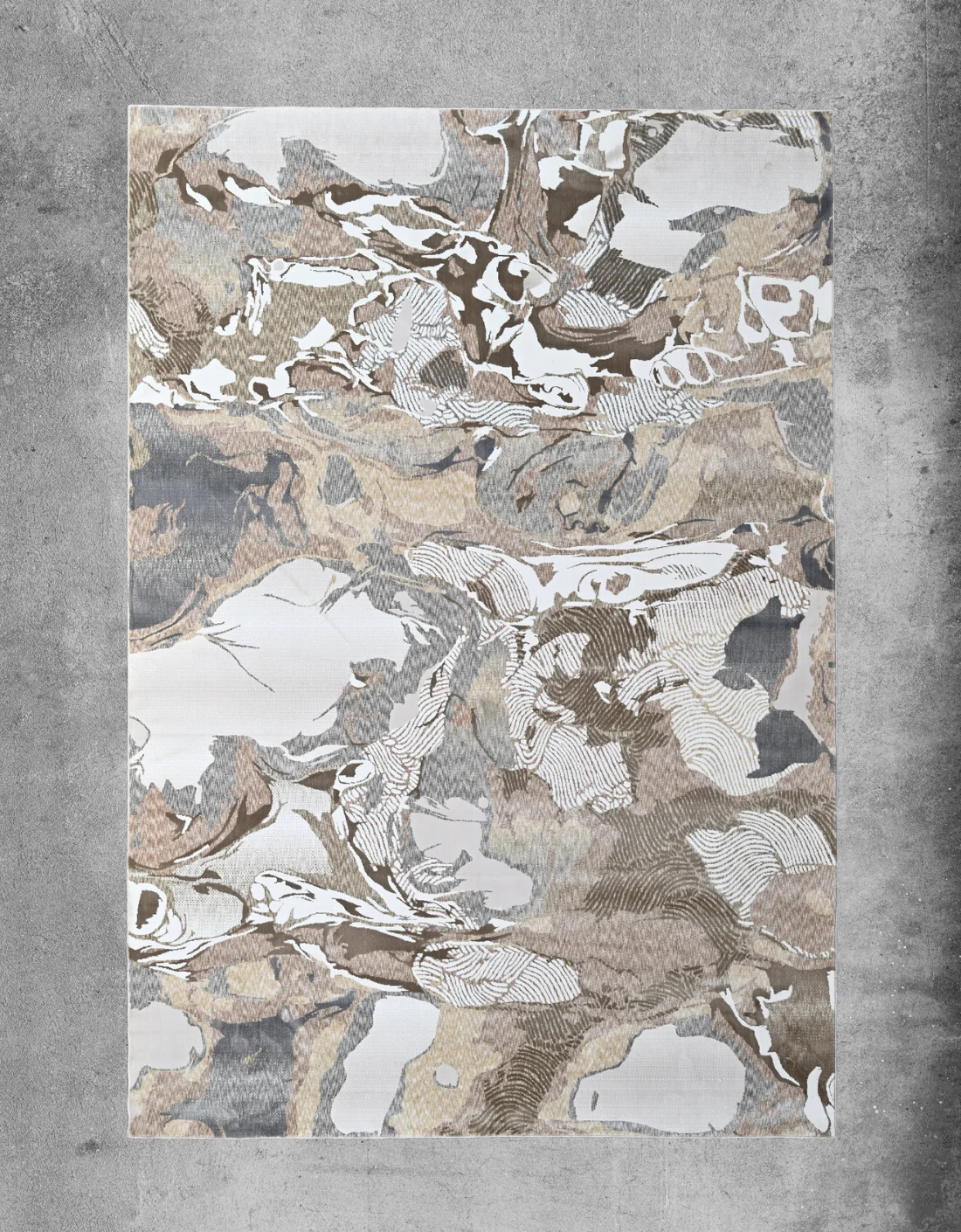 Step into a dreamscape of earthy elegance with “Marbled Mirage”, a rug that merges the organic flow of natural stone with the intricacy of hand-drawn textures. This stunning design channels the unpredictable beauty of marble veining and geological formations, rendered in a palette of warm mocha, ivory, beige, and soft charcoal.