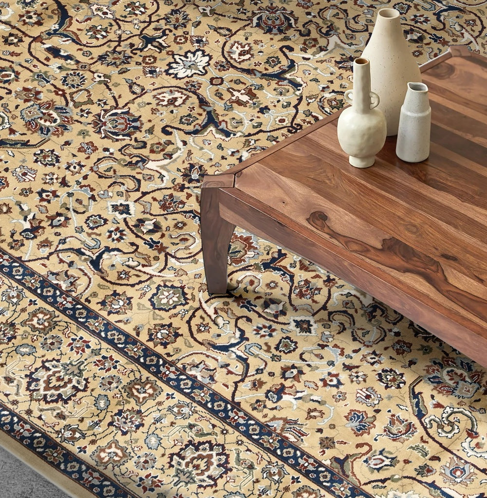 This intricately designed rug brings timeless charm to your living space with its detailed patterns and refined borders. The delicate floral motifs and balanced composition make it a sophisticated addition to any home.