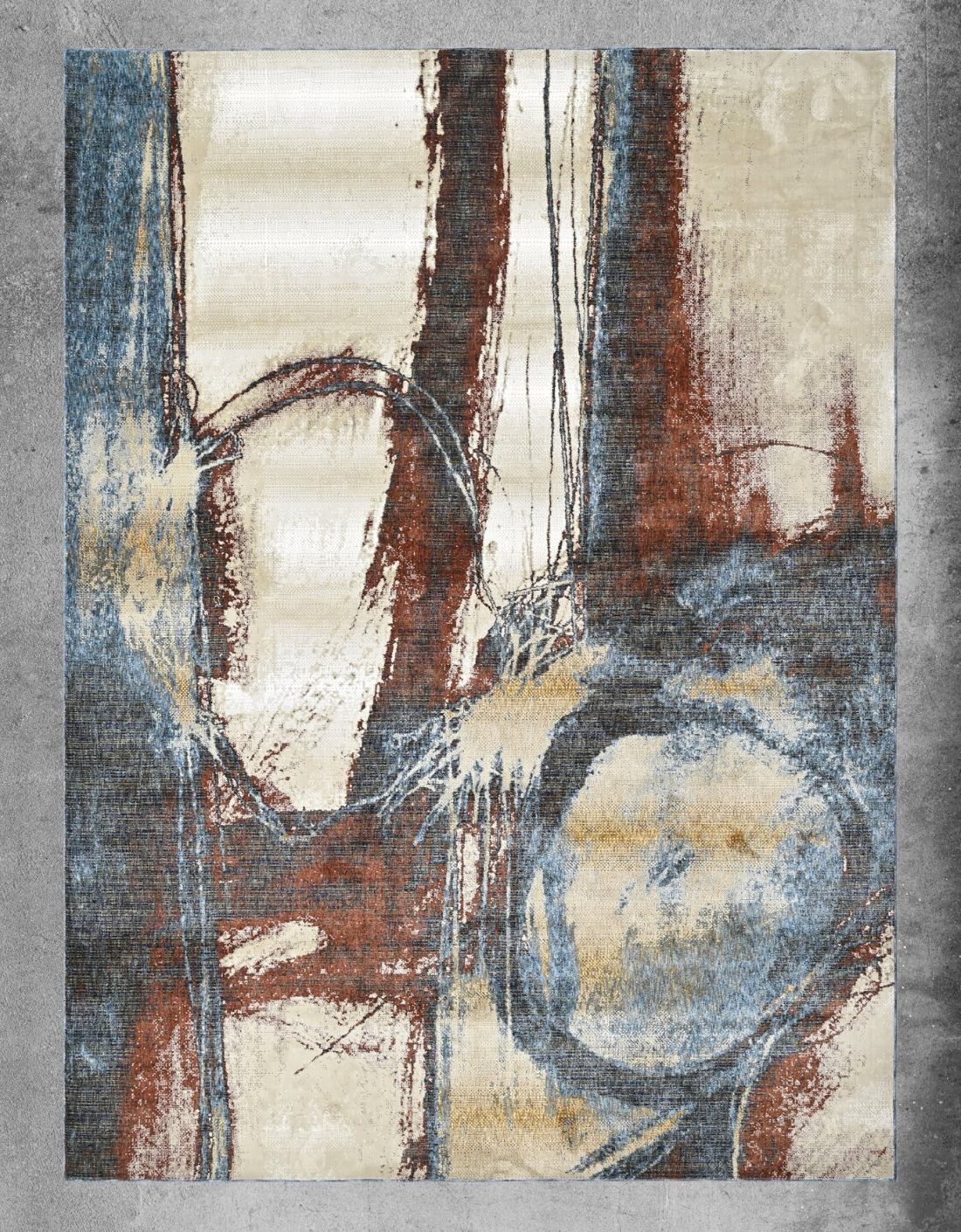 The Terra Aura Powerloom Rug celebrates artistic abstraction with expressive strokes of rust, blue, and ivory layered against a neutral backdrop. Its painterly composition evokes the raw energy of modern art, transforming floors into canvases of bold expression. Powerloom craftsmanship ensures fine detail, color clarity, and lasting performance while maintaining a luxuriously soft touch.