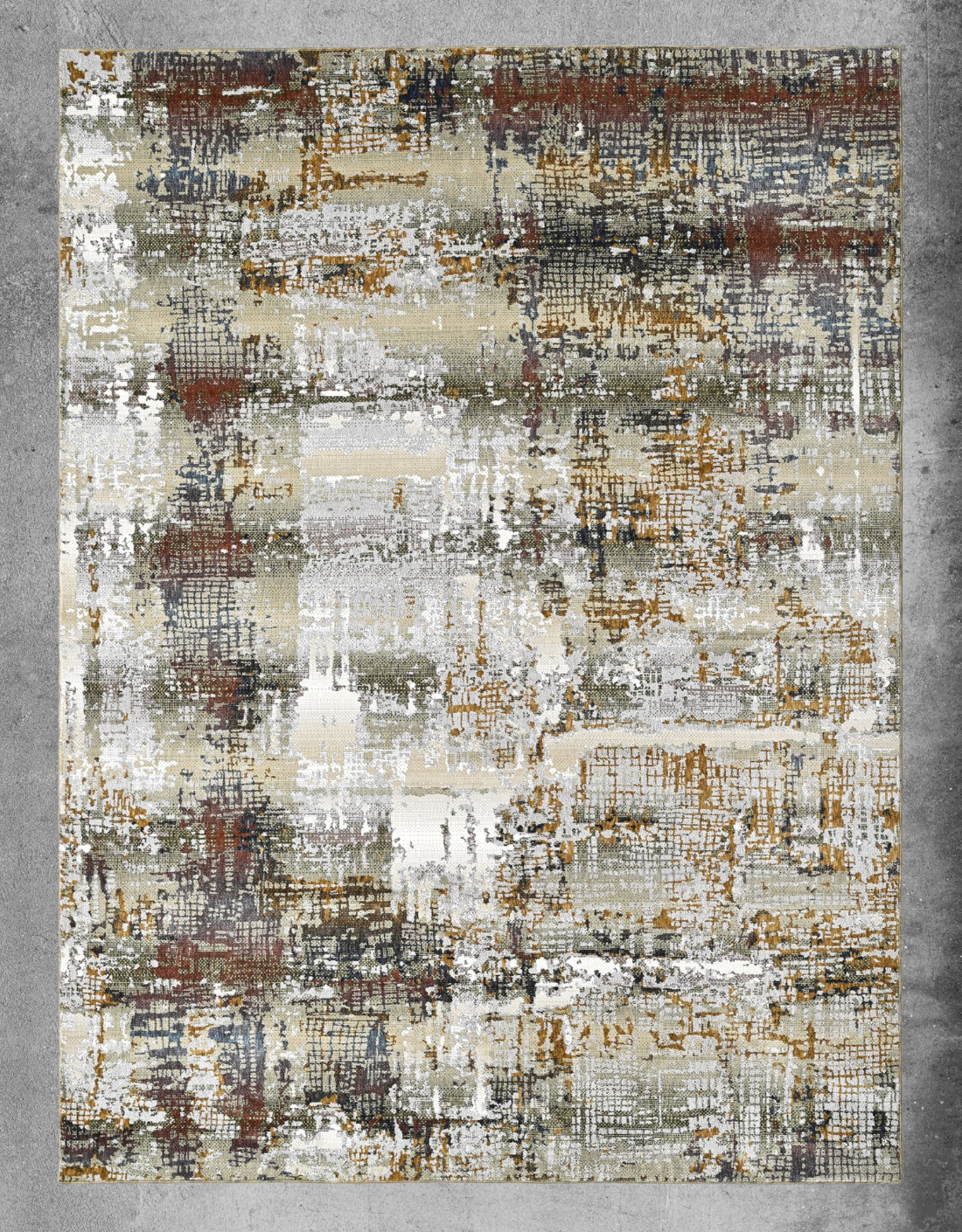 Fresco Fade Powerloom Rug blends horizontal striations and abstract textures in neutral, olive, and charcoal tones. Its look mimics a weathered mural or aged wall fresco — softly faded but full of depth.