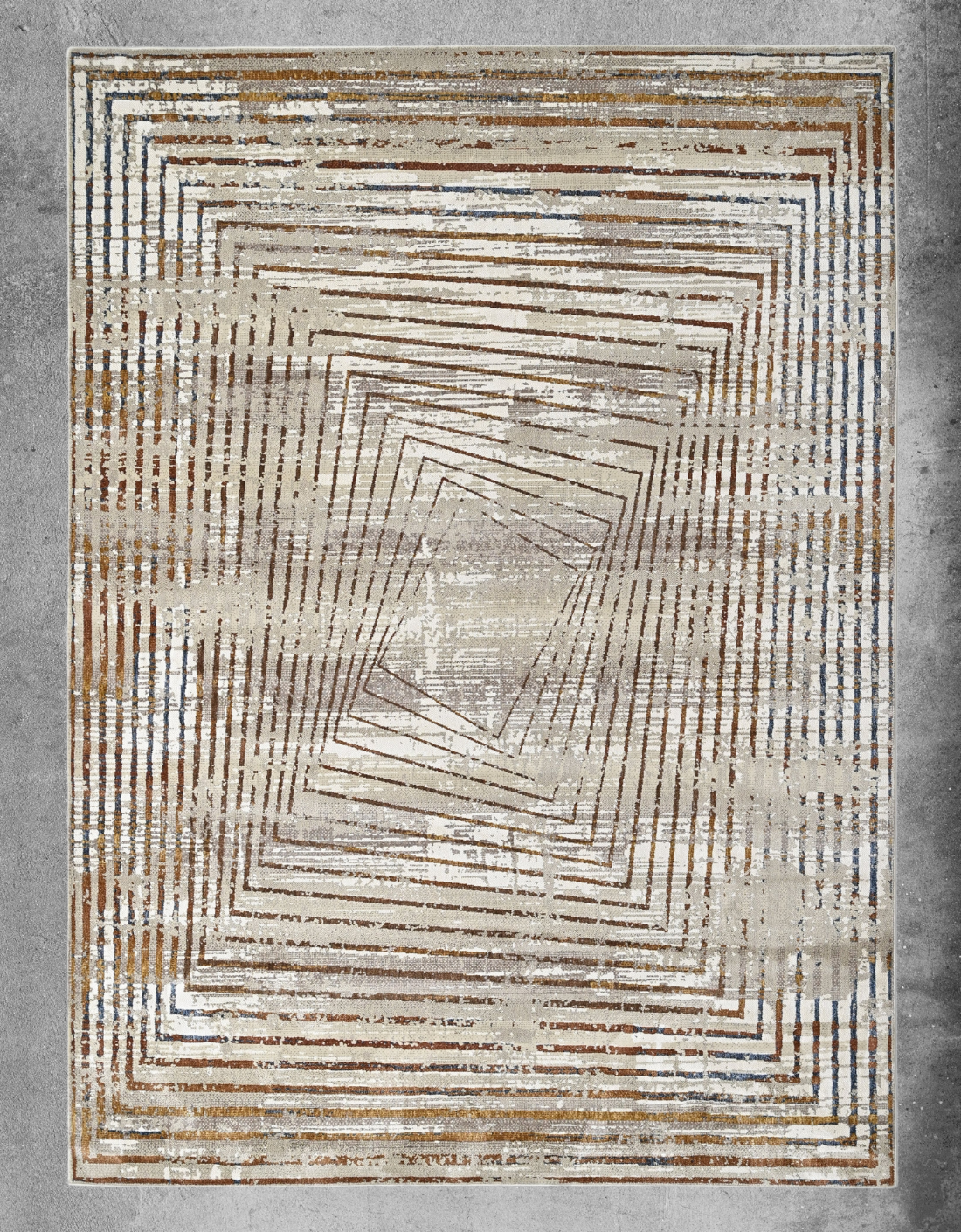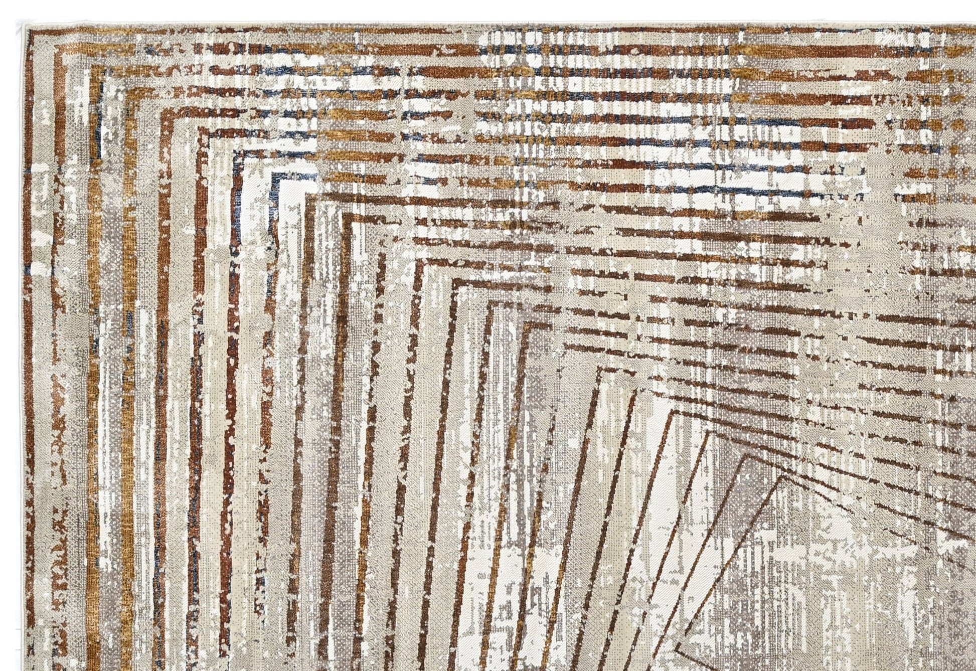 Vortex Ember Powerloom Rug glows with rich, ember-like tones of rust, copper, and beige, arranged in a dynamic inward spiral. It gives the impression of motion and warmth in a refined, linear form.