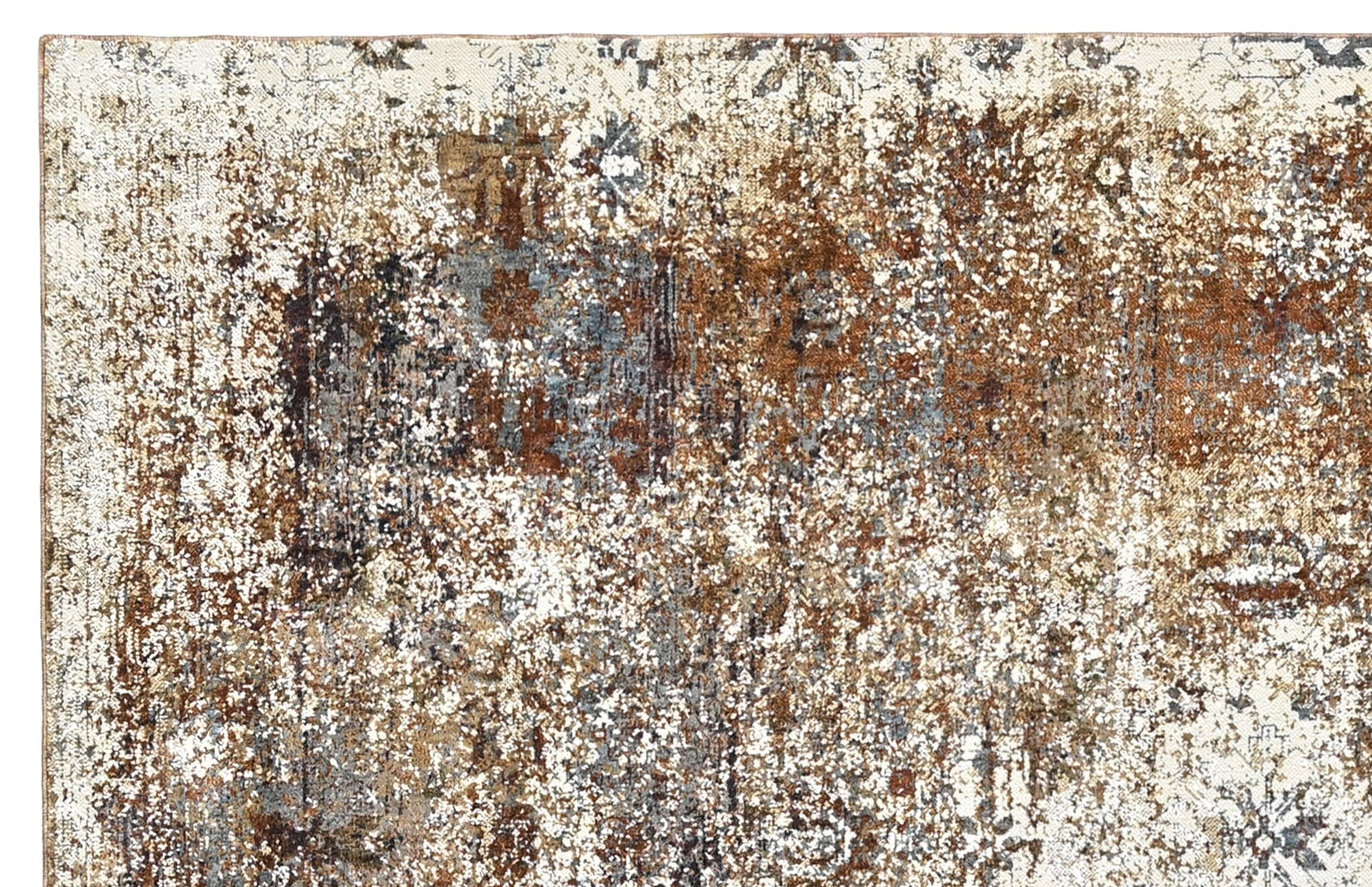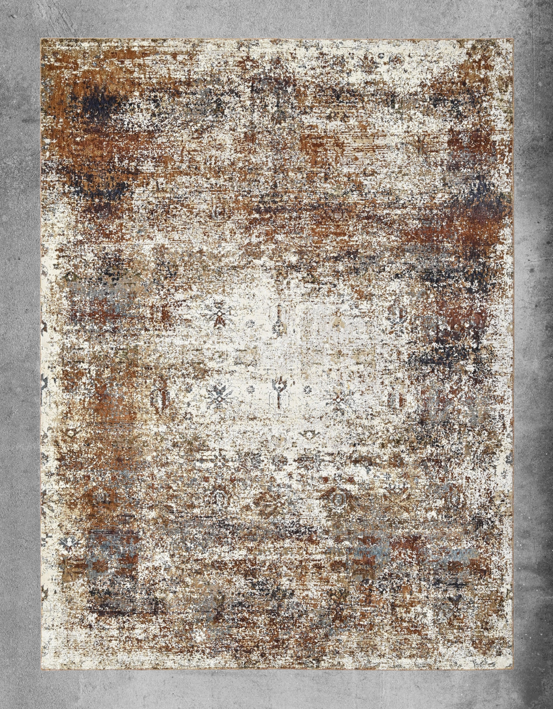 The Rust Patina Powerloom Rug showcases a beautifully worn abstract pattern, where burnt orange, ivory, and slate hues blend like layers of oxidized metal or weathered plaster. Its distressed finish gives it an aged, tactile look without compromising comfort.