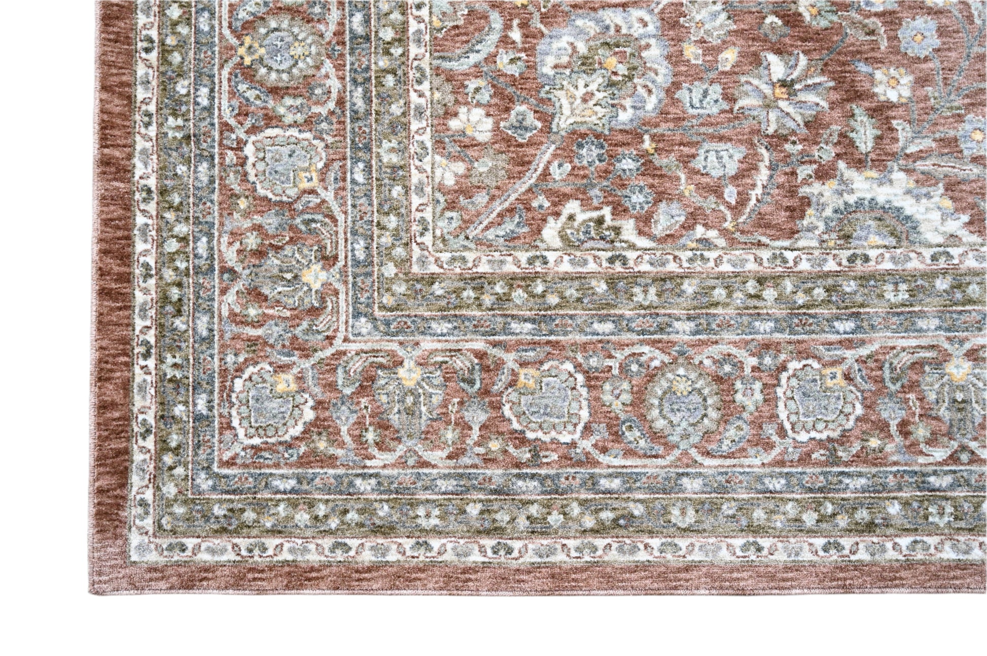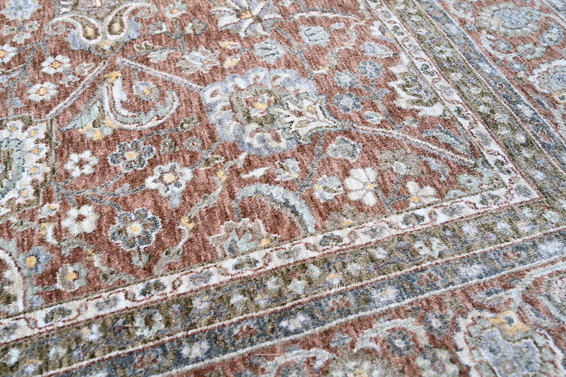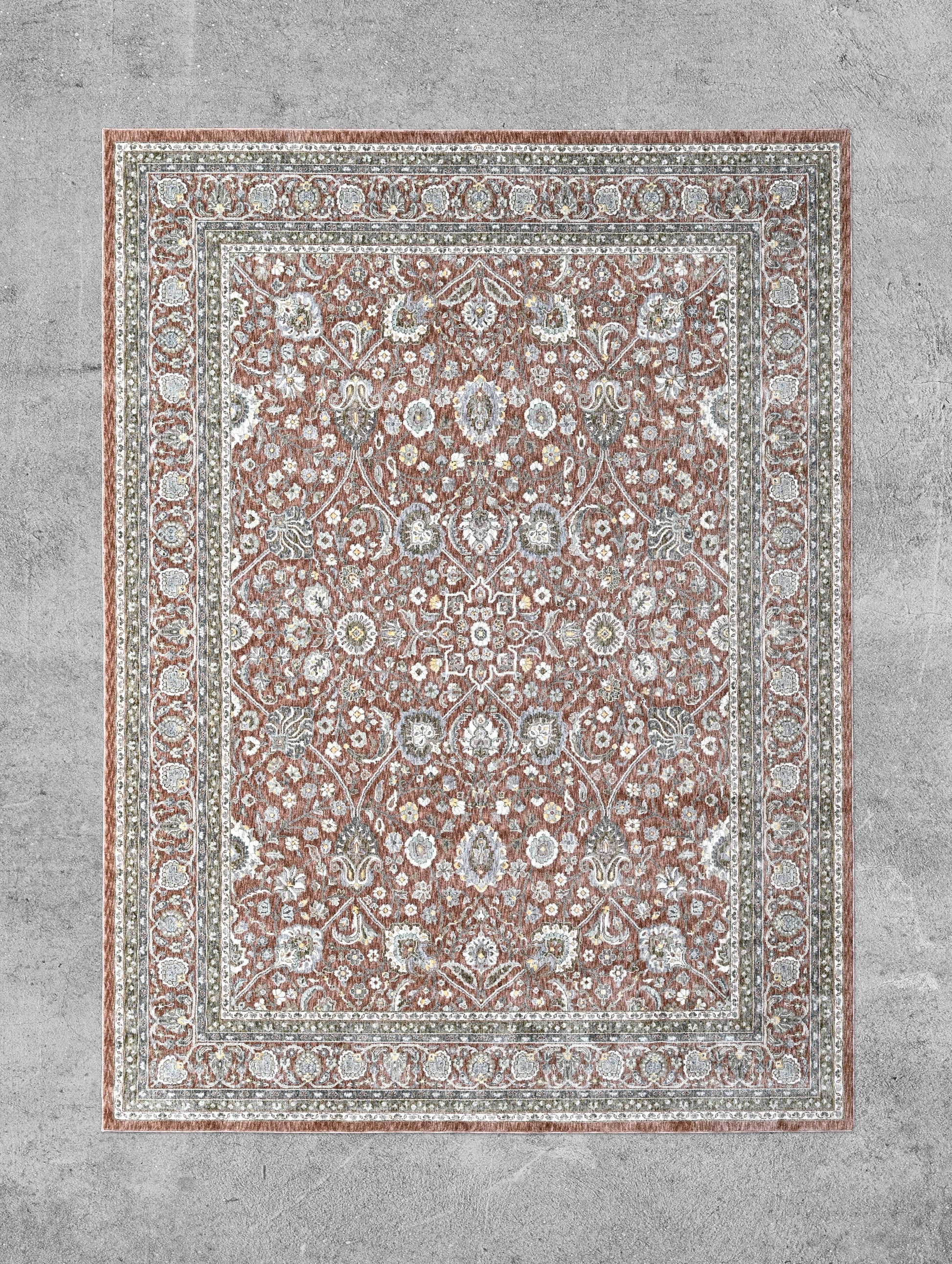 Inspired by the tranquil elegance of ocean waves meeting the shore, the Sea Breeze carpet is a masterpiece of timeless design and craftsmanship. The soft, muted tones of seafoam green, sandy beige, and delicate hints of blue create a sophisticated yet soothing palette, reminiscent of a gentle coastal breeze rustling through the dunes. Intricately woven floral and botanical motifs bring a sense of tradition, while the finely detailed border enhances the richness of its classic aesthetic. The harmonious blend of colors and patterns gives this piece a refined, vintage allure that seamlessly complements both modern and traditional interiors, making it a statement of elegance in any setting.