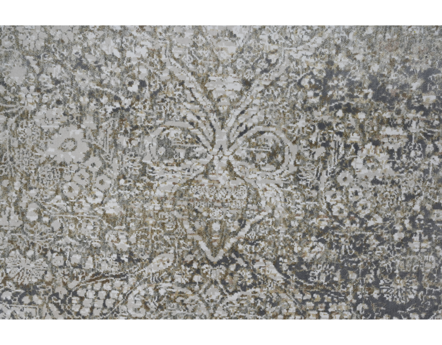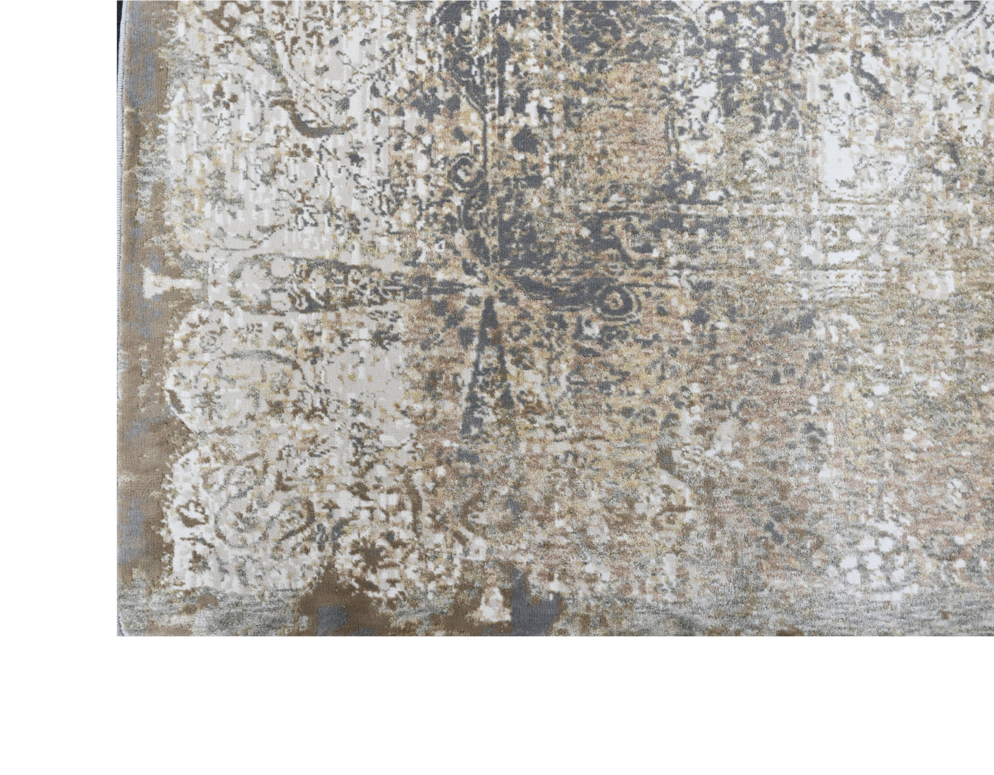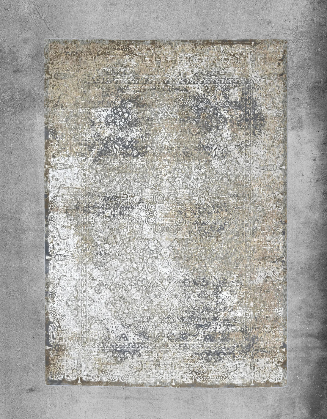 Shadow Veil evokes the allure of a weathered heirloom, its intricate detailing softened by time yet enriched by character. This piece features a layered composition of traditional Persian motifs gently overlaid with a distressed silver and taupe wash, giving it an authentically aged patina. The deliberate fading across the design mimics the subtle erosion of vintage textiles, creating a poetic contrast between ornate formality and relaxed charm.