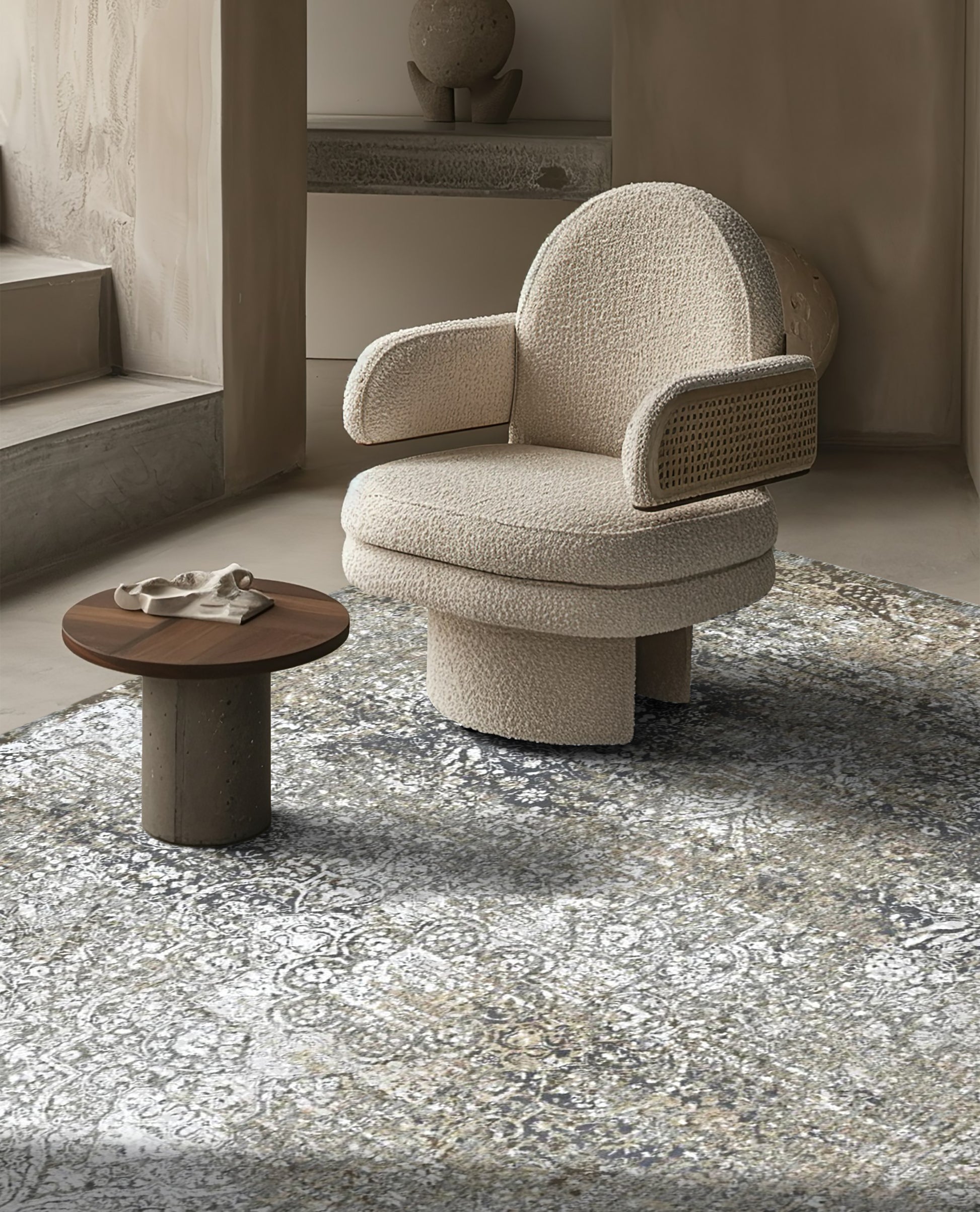 Its color palette, a blend of silvery grey, charcoal, and golden beige, makes it exceptionally versatile—equally suited to classic interiors as well as modern, industrial, or bohemian settings. The detailed border frames the composition without overpowering the interior pattern, creating a harmonious balance that draws the eye inward. With its artfully subdued tones and worn-in texture, Shadow Veil becomes more than a rug—it’s a backdrop to a story, a quiet witness to the style of the room it graces.