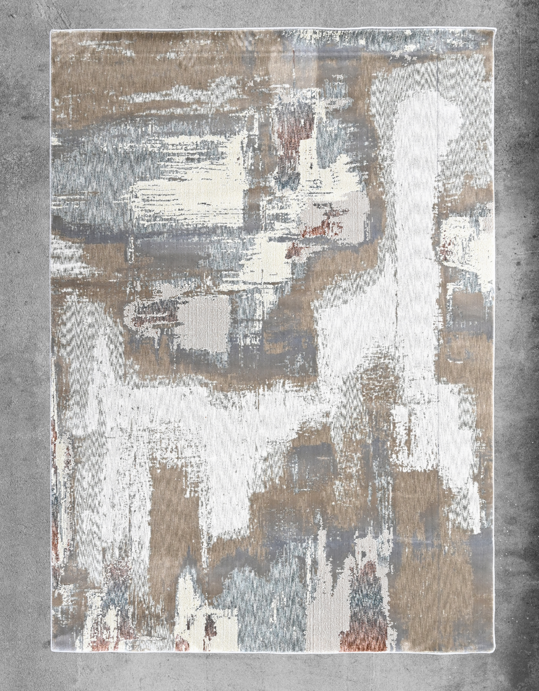 The Terracotta Mirage Powerloom Rug blends warm earthy browns, soft ivory, and muted charcoal strokes in an abstract painterly design. Its layered textures mimic the faded beauty of sunlit walls and aged landscapes, evoking the mystery of forgotten cities and timeless artistry.